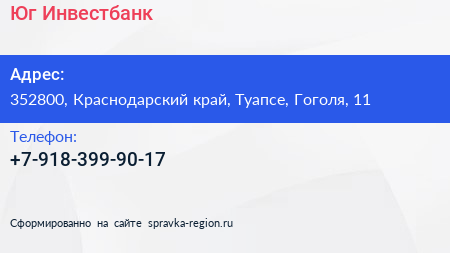 Юг-Инвестбанк по адресу 352800, Краснодарский край, Туапсе, Гоголя, 11 в дальнейшем Организация, размещена в следующих категориях:
