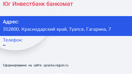 Юг-Инвестбанк, банкомат по адресу 352800, Краснодарский край, Туапсе, Гагарина, 7 в дальнейшем Организация, размещена в следующих категориях: