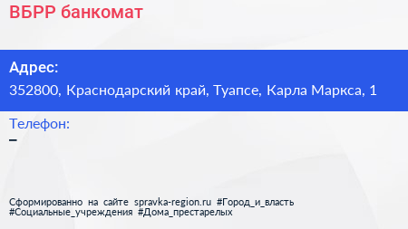 ВБРР, банкомат по адресу 352800, Краснодарский край, Туапсе, Карла Маркса, 1 в дальнейшем Организация, размещена в следующих категориях: