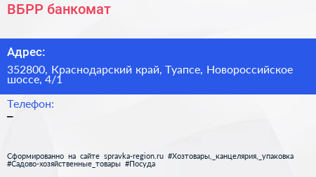 ВБРР, банкомат по адресу 352800, Краснодарский край, Туапсе, Новороссийское шоссе, 4/1 в дальнейшем Организация, размещена в следующих категориях: