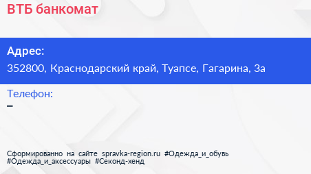 ВТБ, банкомат по адресу 352800, Краснодарский край, Туапсе, Гагарина, 3а в дальнейшем Организация, размещена в следующих категориях: