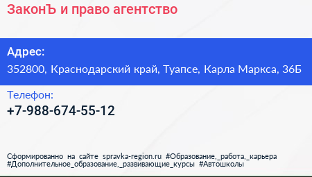 ЗаконЪ и право, агентство по адресу 352800, Краснодарский край, Туапсе, Карла Маркса, 36Б в дальнейшем Организация, размещена в следующих категориях: