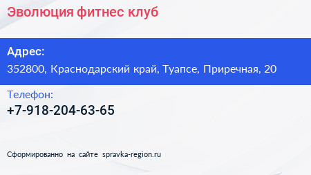 Эволюция, фитнес-клуб по адресу 352800, Краснодарский край, Туапсе, Приречная, 20 в дальнейшем Организация, размещена в следующих категориях: