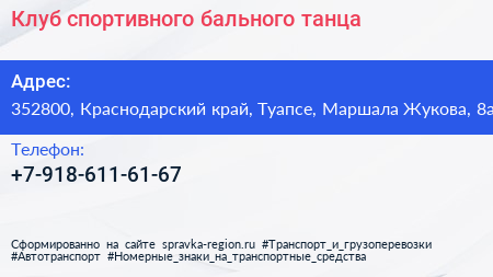 Клуб спортивного бального танца по адресу 352800, Краснодарский край, Туапсе, Маршала Жукова, 8а в дальнейшем Организация, размещена в следующих категориях: