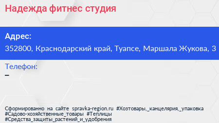 Надежда, фитнес-студия по адресу 352800, Краснодарский край, Туапсе, Маршала Жукова, 3 в дальнейшем Организация, размещена в следующих категориях: