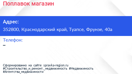 Поплавок, магазин по адресу 352800, Краснодарский край, Туапсе, Фрунзе, 40а в дальнейшем Организация, размещена в следующих категориях: