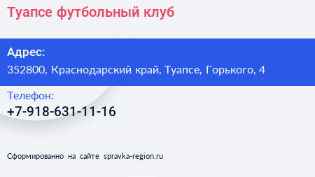 Туапсе, футбольный клуб по адресу 352800, Краснодарский край, Туапсе, Горького, 4 в дальнейшем Организация, размещена в следующих категориях: