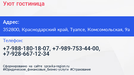 Уют, гостиница по адресу 352800, Краснодарский край, Туапсе, Комсомольская, 9а в дальнейшем Организация, размещена в следующих категориях:
