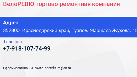 ВелоРЕВЮ, торгово-ремонтная компания по адресу 352800, Краснодарский край, Туапсе, Маршала Жукова, 18 в дальнейшем Организация, размещена в следующих категориях:
