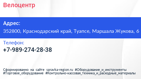 Велоцентр по адресу 352800, Краснодарский край, Туапсе, Маршала Жукова, 6 в дальнейшем Организация, размещена в следующих категориях: