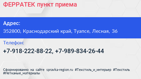 ФЕРРАТЕК, пункт приема по адресу 352800, Краснодарский край, Туапсе, Лесная, 36 в дальнейшем Организация, размещена в следующих категориях: