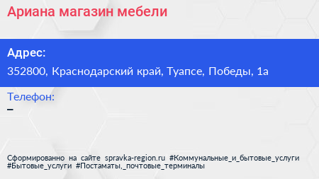 Ариана, магазин мебели по адресу 352800, Краснодарский край, Туапсе, Победы, 1а в дальнейшем Организация, размещена в следующих категориях: