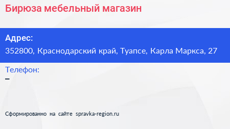 Бирюза, мебельный магазин по адресу 352800, Краснодарский край, Туапсе, Карла Маркса, 27 в дальнейшем Организация, размещена в следующих категориях: