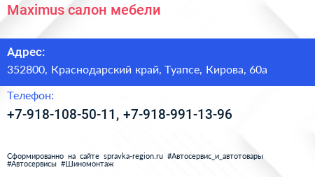 Maximus, салон мебели по адресу 352800, Краснодарский край, Туапсе, Кирова, 60а в дальнейшем Организация, размещена в следующих категориях: