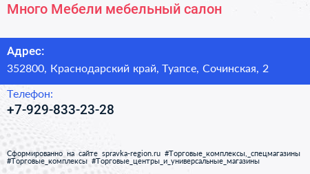 Много Мебели, мебельный салон по адресу 352800, Краснодарский край, Туапсе, Сочинская, 2 в дальнейшем Организация, размещена в следующих категориях:
