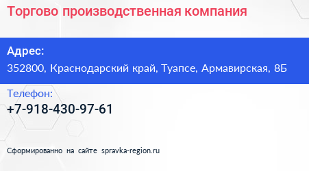 Торгово-производственная компания по адресу 352800, Краснодарский край, Туапсе, Армавирская, 8Б в дальнейшем Организация, размещена в следующих категориях: