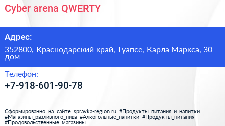 Cyber arena QWERTY по адресу 352800, Краснодарский край, Туапсе, Карла Маркса, 30 дом в дальнейшем Организация, размещена в следующих категориях: