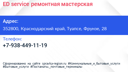 ED serviсе, ремонтная мастерская по адресу 352800, Краснодарский край, Туапсе, Фрунзе, 28 в дальнейшем Организация, размещена в следующих категориях: