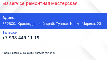 ED serviсе, ремонтная мастерская по адресу 352800, Краснодарский край, Туапсе, Карла Маркса, 23 в дальнейшем Организация, размещена в следующих категориях: