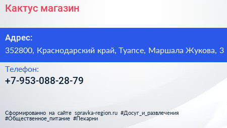 Кактус, магазин по адресу 352800, Краснодарский край, Туапсе, Маршала Жукова, 3 в дальнейшем Организация, размещена в следующих категориях: