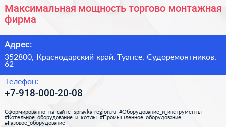 Максимальная мощность, торгово-монтажная фирма по адресу 352800, Краснодарский край, Туапсе, Судоремонтников, 62 в дальнейшем Организация, размещена в следующих категориях: