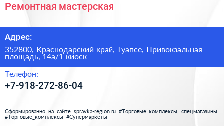 Ремонтная мастерская по адресу 352800, Краснодарский край, Туапсе, Привокзальная площадь, 14а/1 киоск в дальнейшем Организация, размещена в следующих категориях: