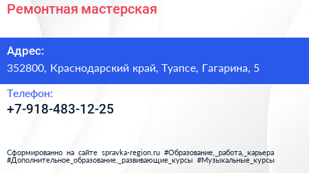 Ремонтная мастерская по адресу 352800, Краснодарский край, Туапсе, Гагарина, 5 в дальнейшем Организация, размещена в следующих категориях: