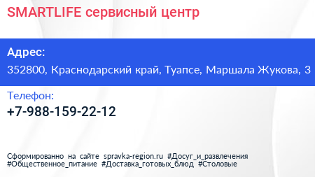SMARTLIFE, сервисный центр по адресу 352800, Краснодарский край, Туапсе, Маршала Жукова, 3 в дальнейшем Организация, размещена в следующих категориях: