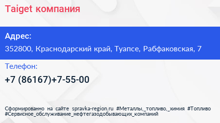 Taiget, компания по адресу 352800, Краснодарский край, Туапсе, Рабфаковская, 7 в дальнейшем Организация, размещена в следующих категориях: