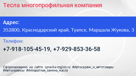 Тесла, многопрофильная компания по адресу 352800, Краснодарский край, Туапсе, Маршала Жукова, 3 в дальнейшем Организация, размещена в следующих категориях: