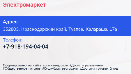 Электромаркет по адресу 352803, Краснодарский край, Туапсе, Калараша, 17а в дальнейшем Организация, размещена в следующих категориях: