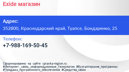 Exide, магазин по адресу 352800, Краснодарский край, Туапсе, Бондаренко, 25 в дальнейшем Организация, размещена в следующих категориях: