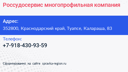 Россудосервис, многопрофильная компания по адресу 352800, Краснодарский край, Туапсе, Калараша, 83 в дальнейшем Организация, размещена в следующих категориях: