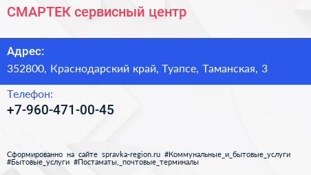 СМАРТЕК, сервисный центр по адресу 352800, Краснодарский край, Туапсе, Таманская, 3 в дальнейшем Организация, размещена в следующих категориях: