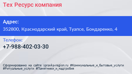Тех Ресурс, компания по адресу 352800, Краснодарский край, Туапсе, Бондаренко, 4 в дальнейшем Организация, размещена в следующих категориях: