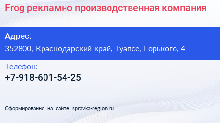 Frog, рекламно-производственная компания по адресу 352800, Краснодарский край, Туапсе, Горького, 4 в дальнейшем Организация, размещена в следующих категориях: