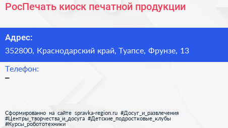 РосПечать, киоск печатной продукции по адресу 352800, Краснодарский край, Туапсе, Фрунзе, 13 в дальнейшем Организация, размещена в следующих категориях: