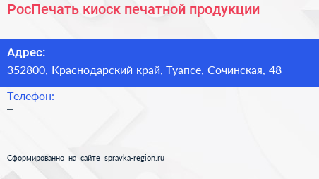 РосПечать, киоск печатной продукции по адресу 352800, Краснодарский край, Туапсе, Сочинская, 48 в дальнейшем Организация, размещена в следующих категориях: