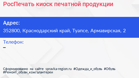 РосПечать, киоск печатной продукции по адресу 352800, Краснодарский край, Туапсе, Армавирская, 2 в дальнейшем Организация, размещена в следующих категориях: