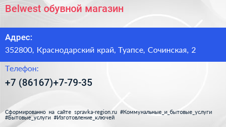 Belwest, обувной магазин по адресу 352800, Краснодарский край, Туапсе, Сочинская, 2 в дальнейшем Организация, размещена в следующих категориях: