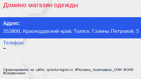 Домино, магазин одежды по адресу 352800, Краснодарский край, Туапсе, Галины Петровой, 5 в дальнейшем Организация, размещена в следующих категориях: