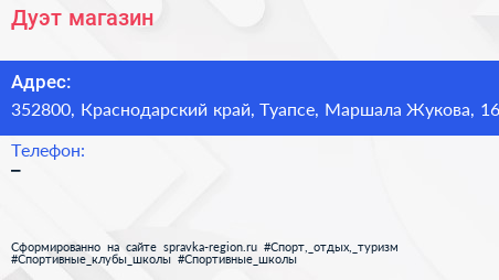 Дуэт, магазин по адресу 352800, Краснодарский край, Туапсе, Маршала Жукова, 16 в дальнейшем Организация, размещена в следующих категориях: