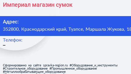 Империал, магазин сумок по адресу 352800, Краснодарский край, Туапсе, Маршала Жукова, 18 в дальнейшем Организация, размещена в следующих категориях: