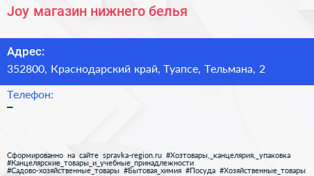 Joy, магазин нижнего белья по адресу 352800, Краснодарский край, Туапсе, Тельмана, 2 в дальнейшем Организация, размещена в следующих категориях: