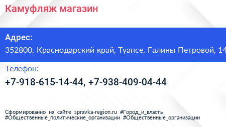 Камуфляж, магазин по адресу 352800, Краснодарский край, Туапсе, Галины Петровой, 14 в дальнейшем Организация, размещена в следующих категориях: