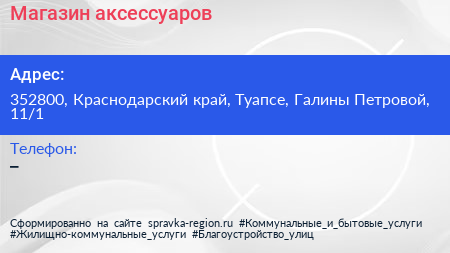 Магазин аксессуаров по адресу 352800, Краснодарский край, Туапсе, Галины Петровой, 11/1 в дальнейшем Организация, размещена в следующих категориях: