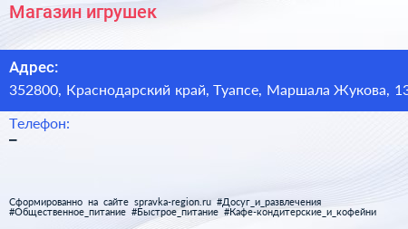 Магазин игрушек по адресу 352800, Краснодарский край, Туапсе, Маршала Жукова, 13 в дальнейшем Организация, размещена в следующих категориях:
