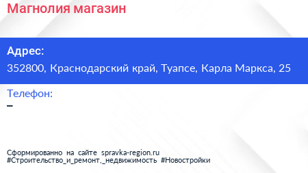 Магнолия, магазин по адресу 352800, Краснодарский край, Туапсе, Карла Маркса, 25 в дальнейшем Организация, размещена в следующих категориях: