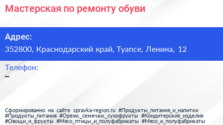 Мастерская по ремонту обуви по адресу 352800, Краснодарский край, Туапсе, Ленина, 12 в дальнейшем Организация, размещена в следующих категориях: