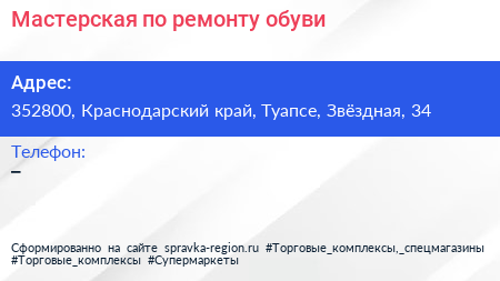 Мастерская по ремонту обуви по адресу 352800, Краснодарский край, Туапсе, Звёздная, 34 в дальнейшем Организация, размещена в следующих категориях: